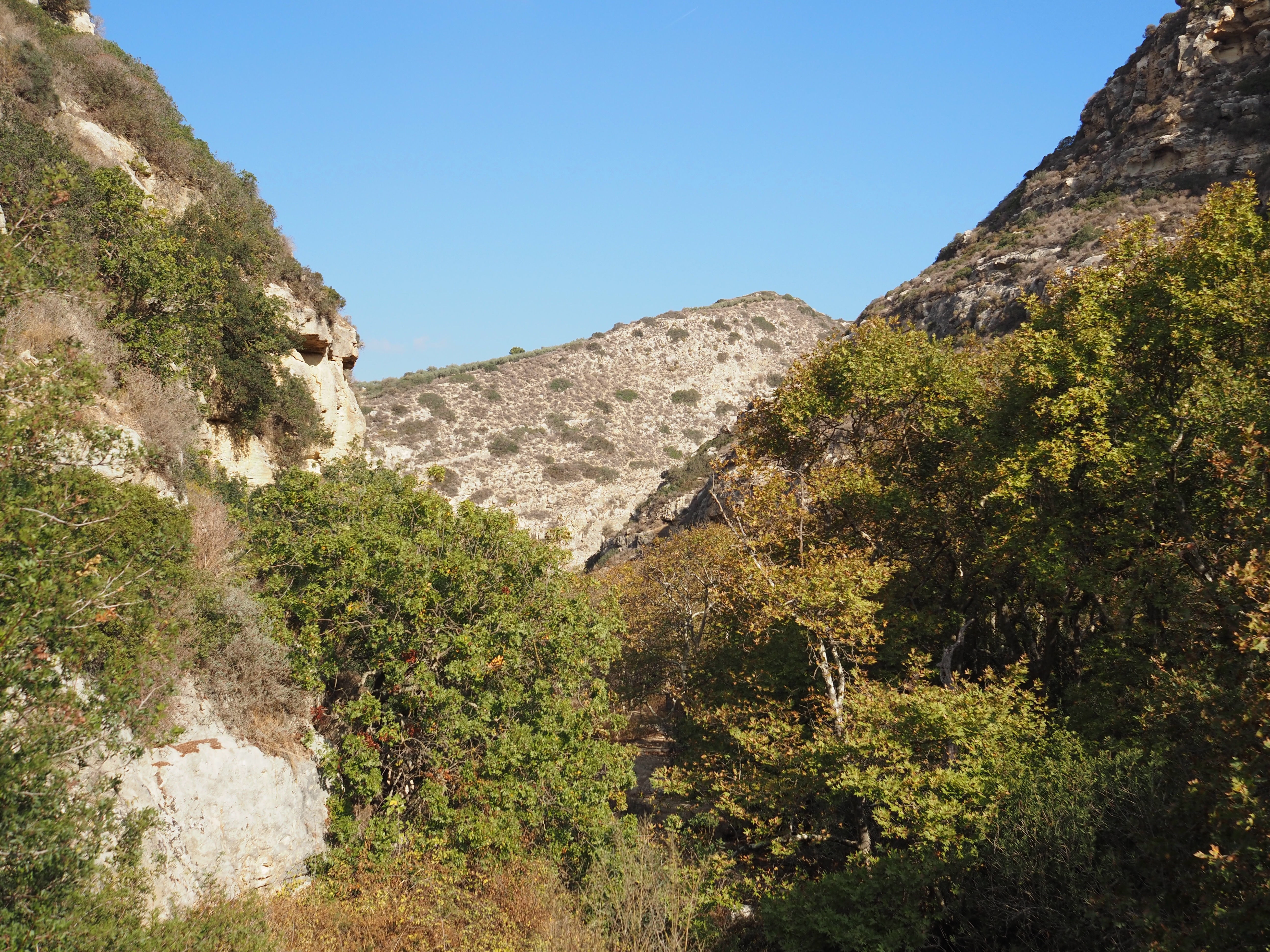 这里展现出克里特岛那种质朴而充满生命力的地貌之美。山谷被层层叠叠的岩壁环抱,岩石裸露而苍茫,带着岁月的纹理。山坡上点缀着低矮的灌木与橄榄树,深绿与灰褐交织成一幅地中海特有的色调。谷底,林木繁茂,阳光穿透叶隙,洒在小径与石墙上,闪烁着温暖的金色。走到尽头有一座简陋的木屋静静伫立在林边。很有点儿秋天的感觉。