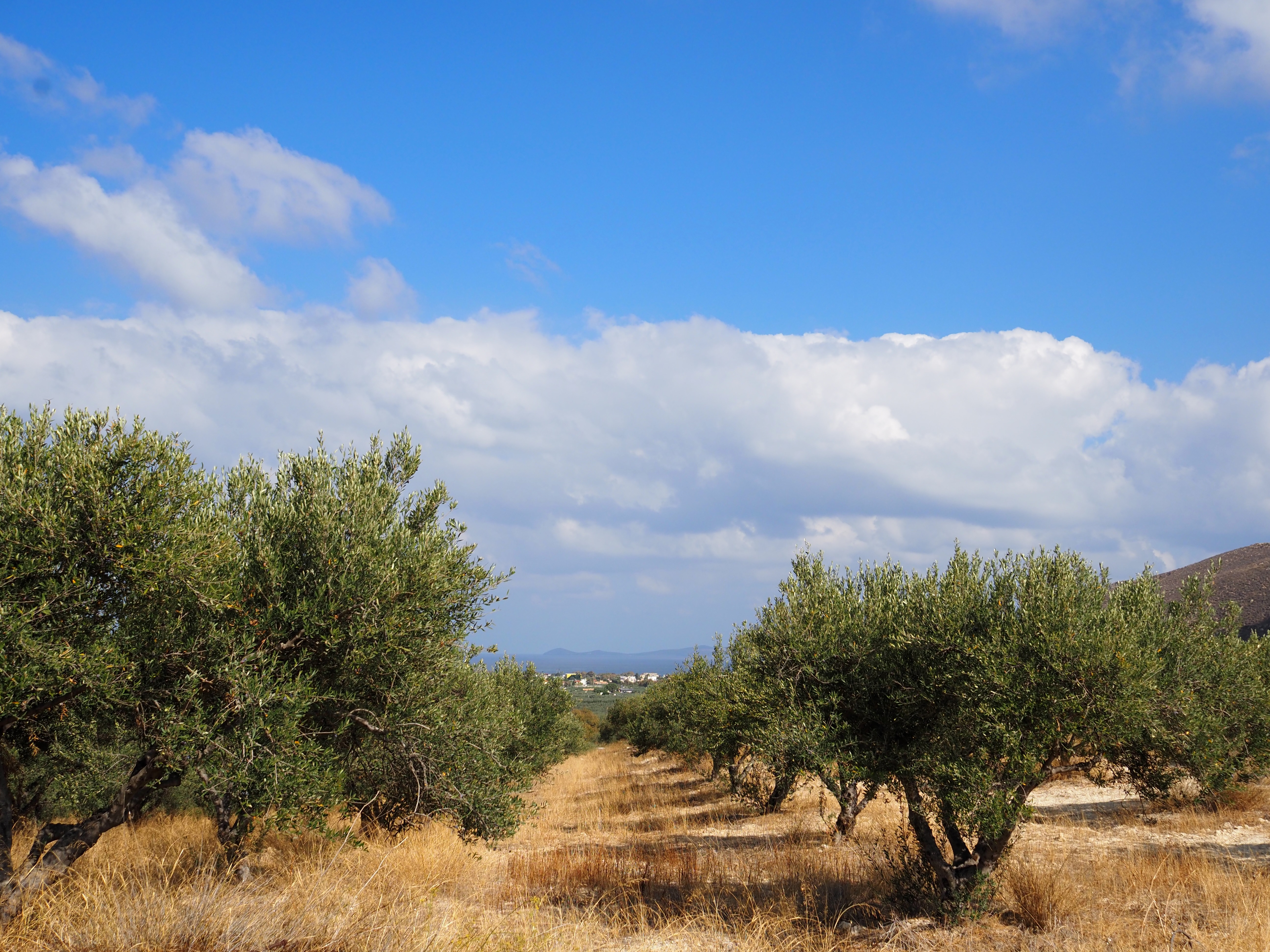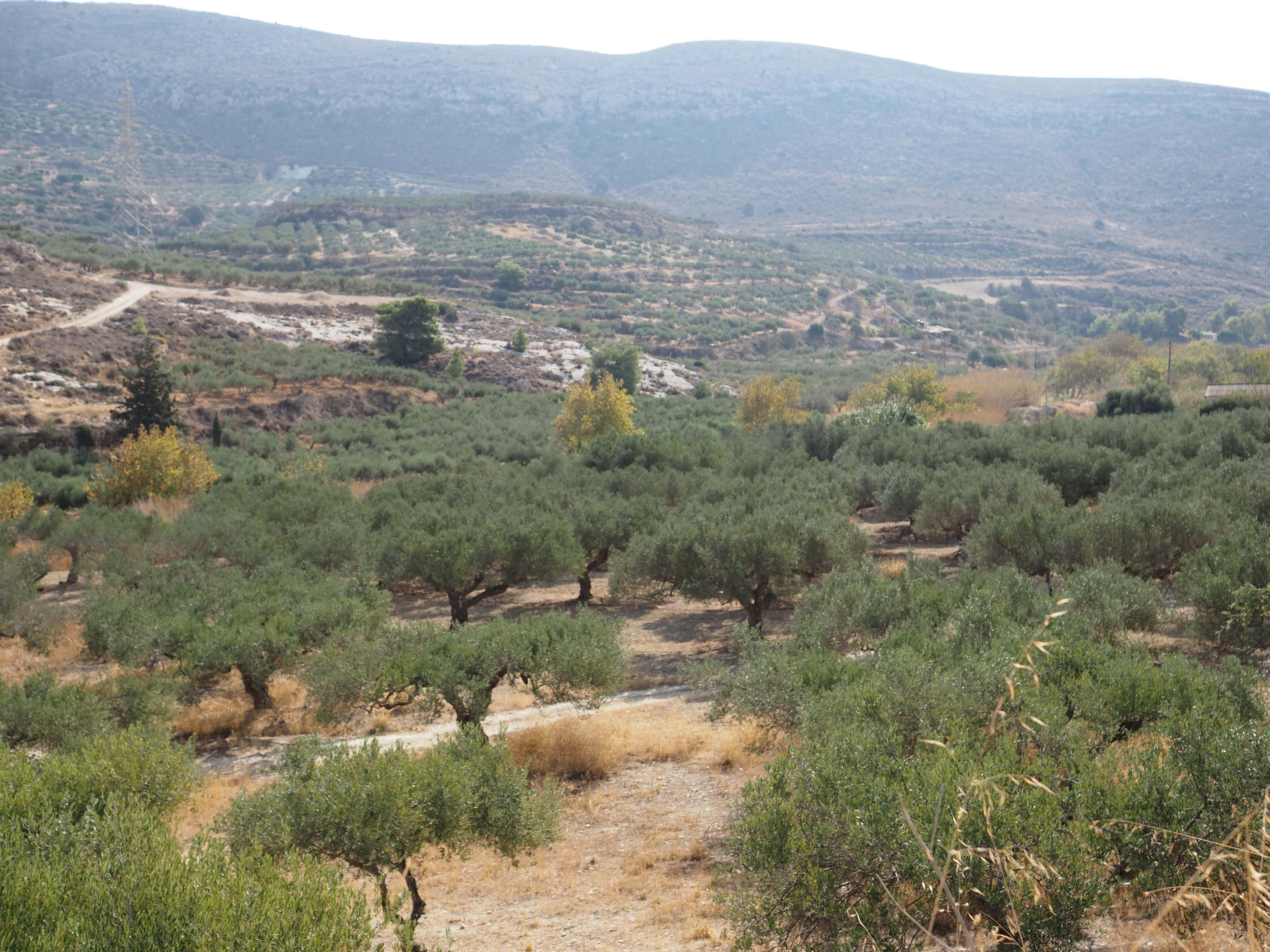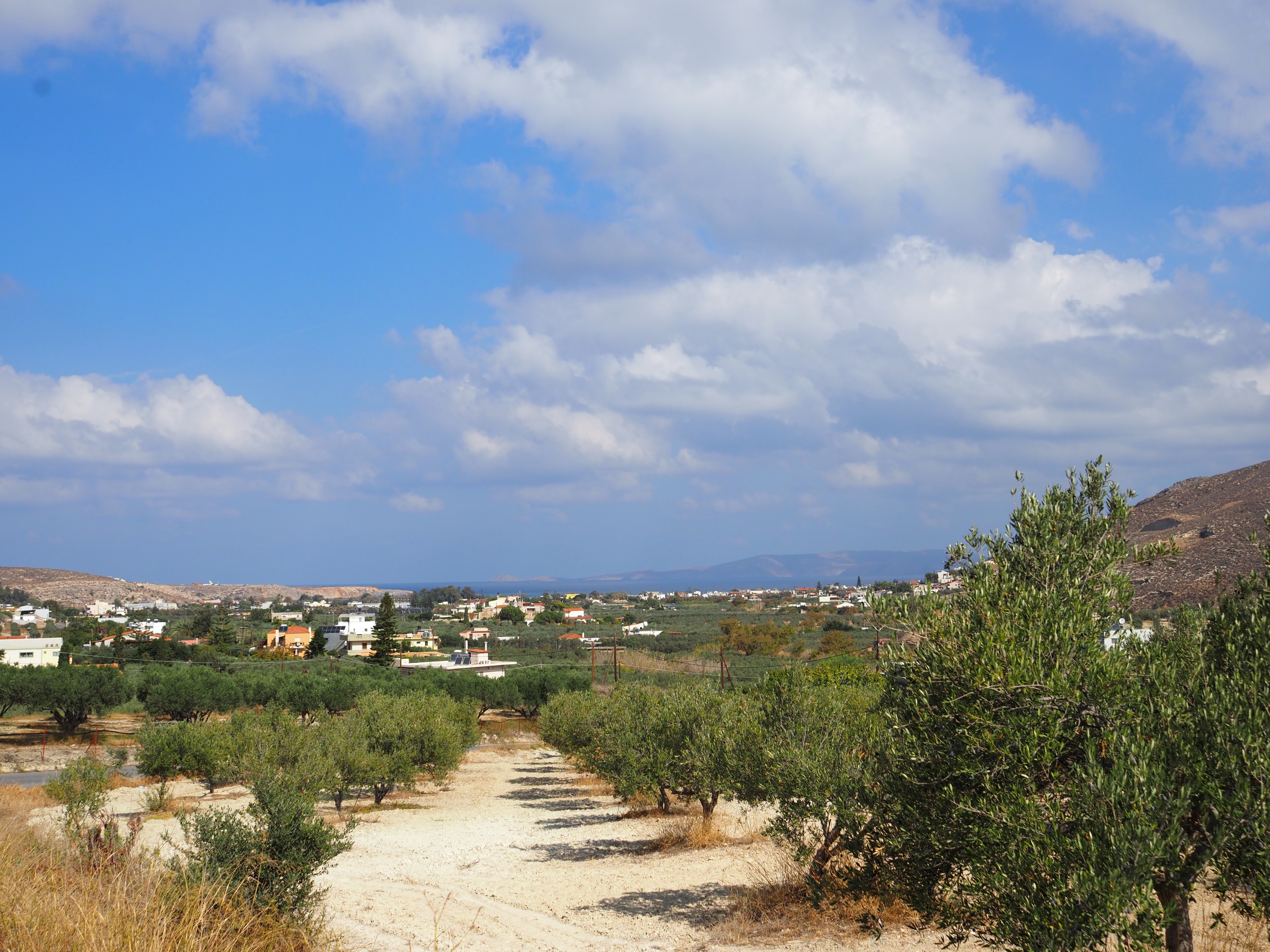 因为没人,就一直沉浸在自然当中,非常安静。走回来时候看天看云看橄榄树。山谷外的丘陵绵延起伏,遍布橄榄园,整齐的树行延伸至地平线,在阳光下泛出柔和的光。远处的小镇散落其间,白色房屋与蓝天相映成趣,远望还可以看到一丝海面和繁忙降落的飞机,机场在那边。