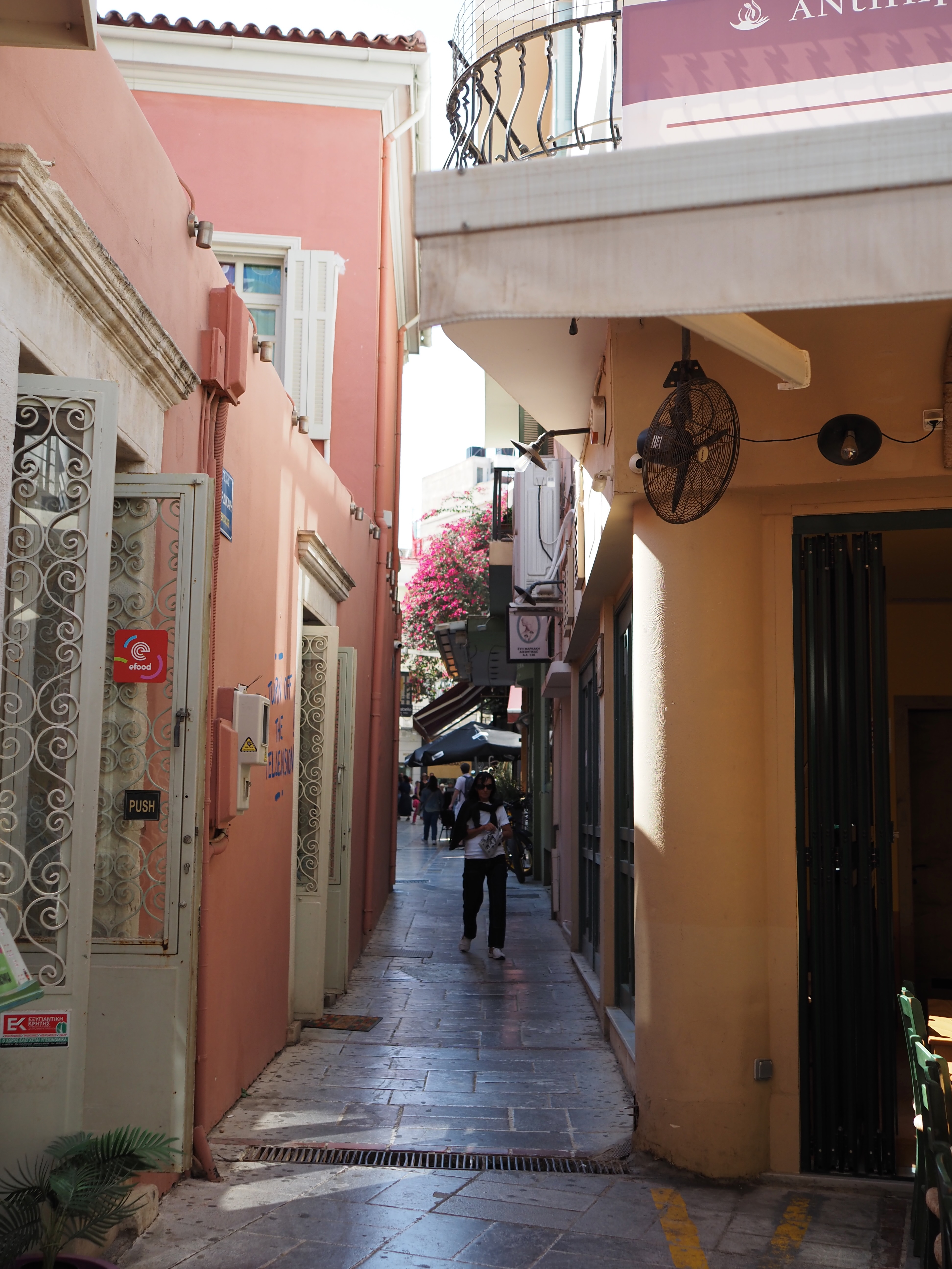 于是我们决定趁这段时间散步去司机口中的狮子广场。这回真切的感受到克里特老城的真正的魅力:古典、浪漫,又充满生活气息。街边是各式各样的小店与餐馆,色彩明快、装饰别致。时不时还能看到精美的老建筑和在阳光下打盹的鸽子。游人如织,伊拉克利翁港也是很多游轮的停靠港口。可以看到导游举着小旗子带领一队人马过来走街串巷,而坐游轮的老年人居多。就这么随便闲逛着,天气温暖,阳光明媚,很喜欢。