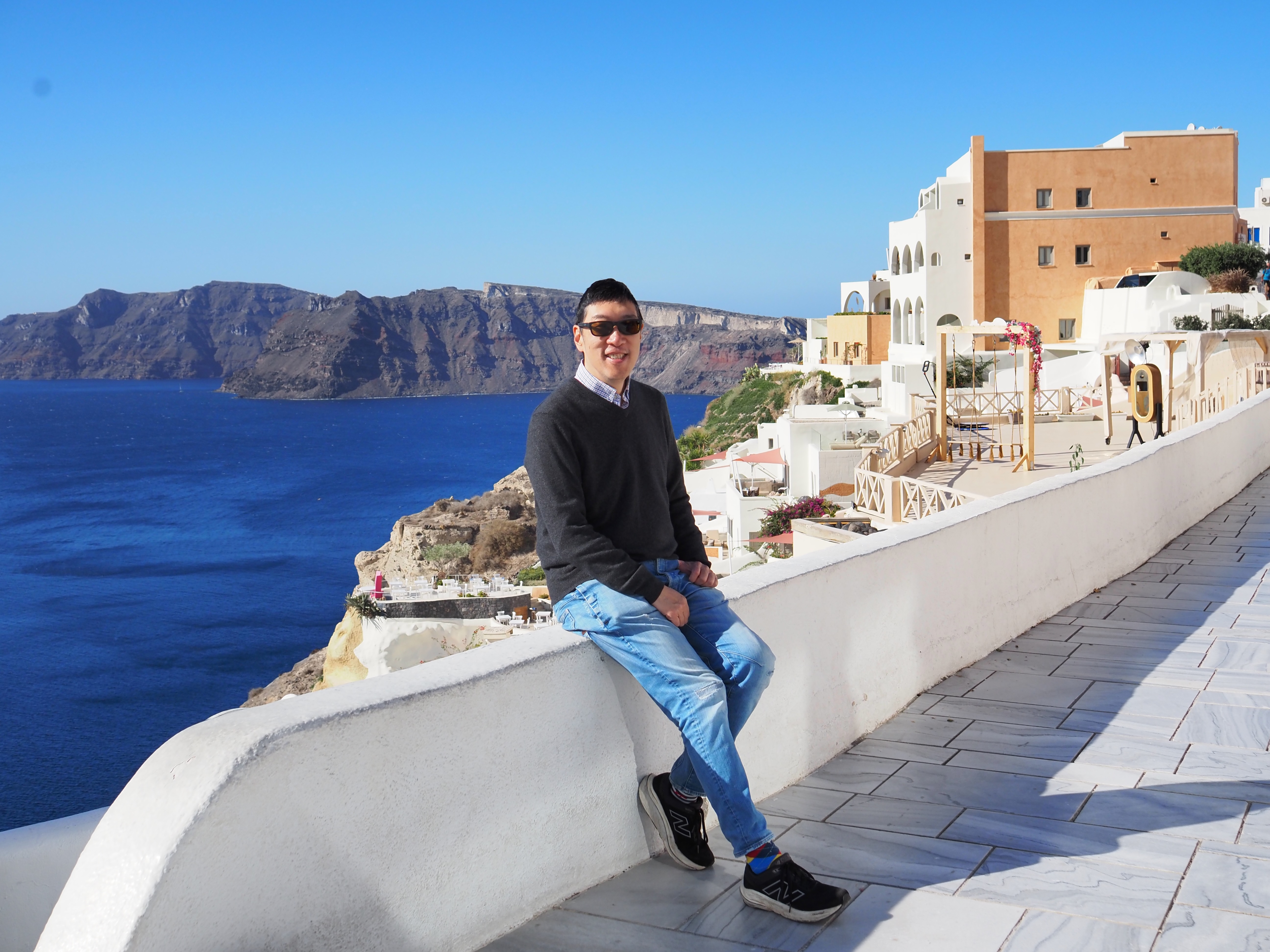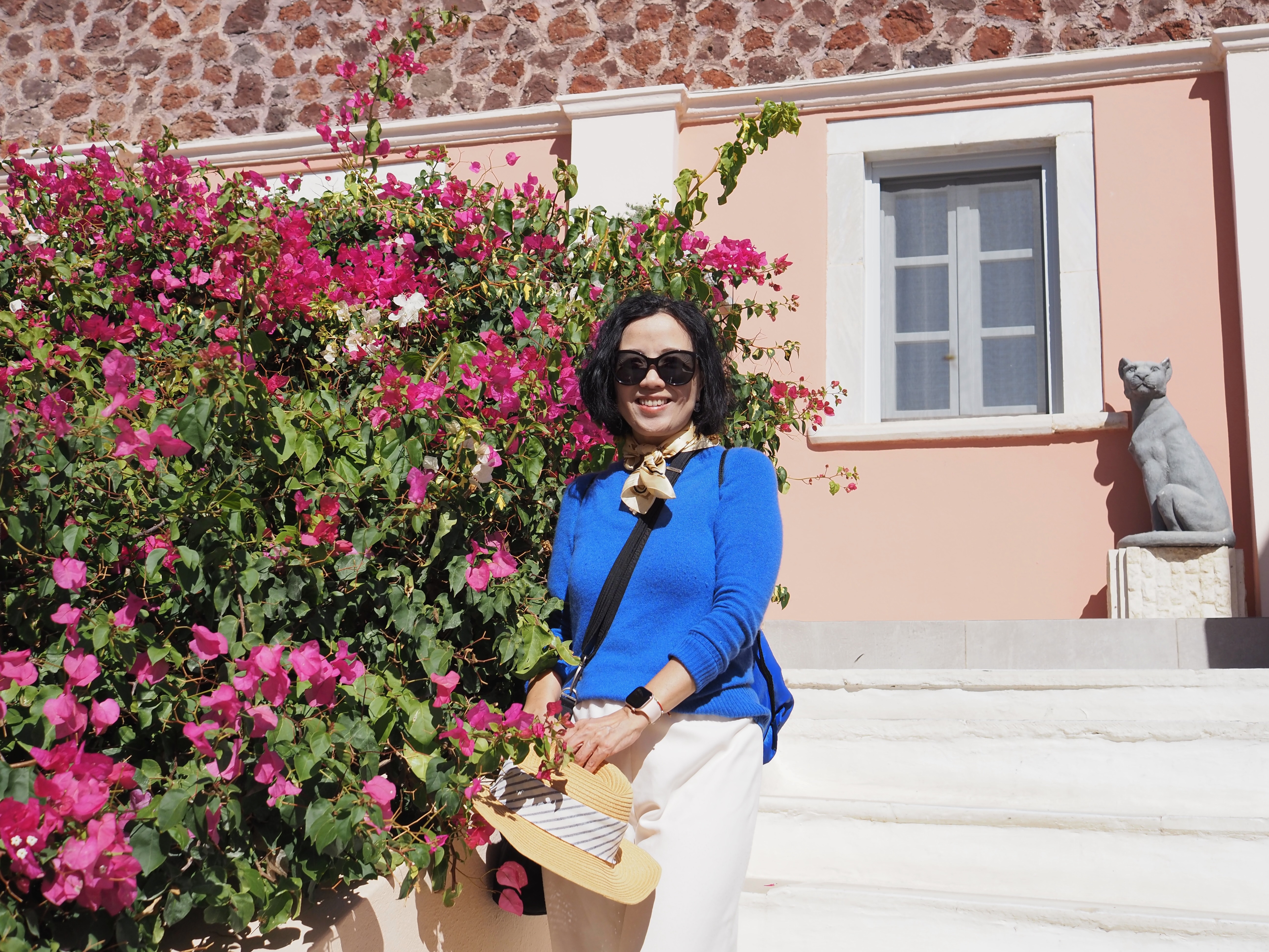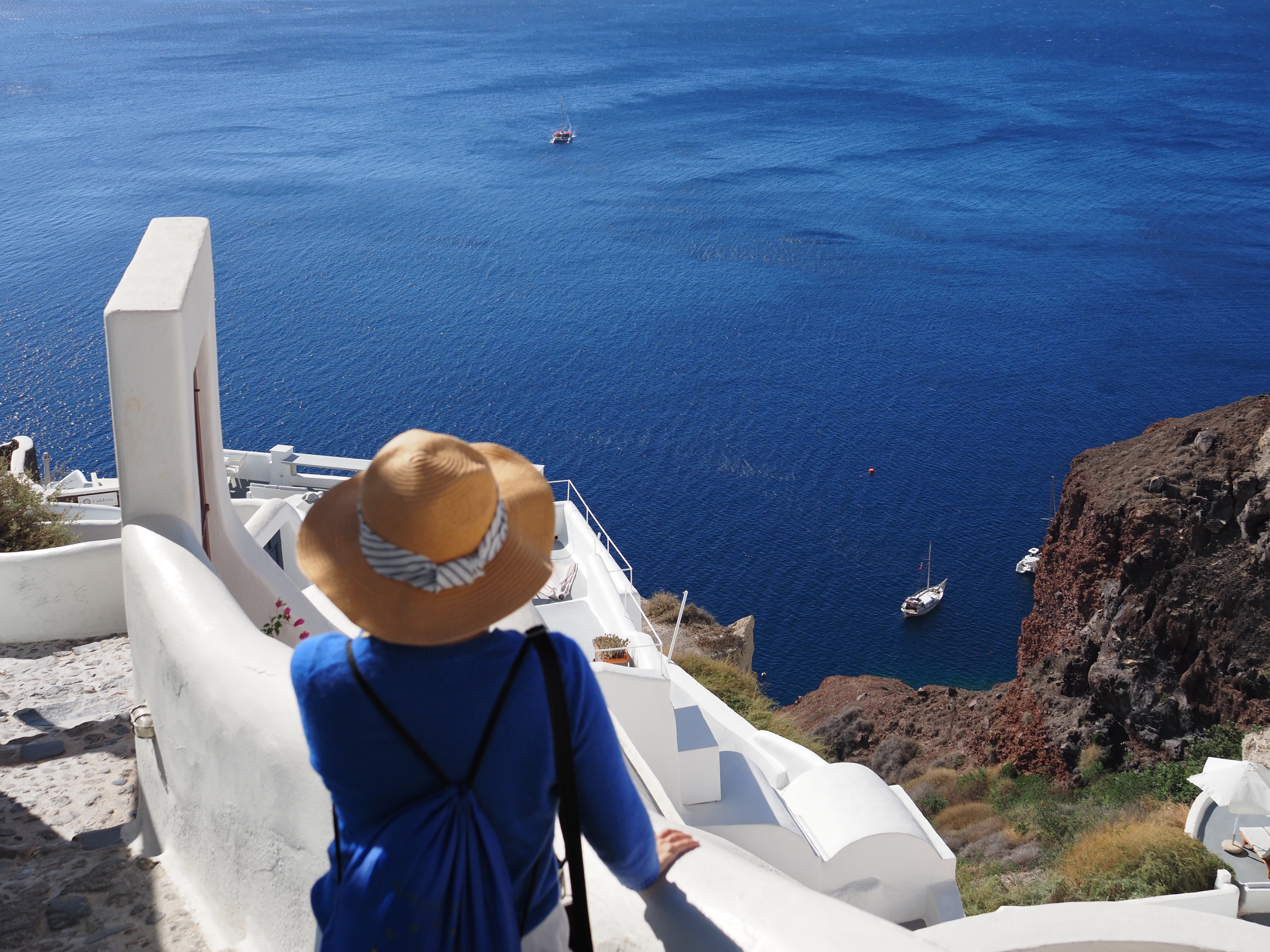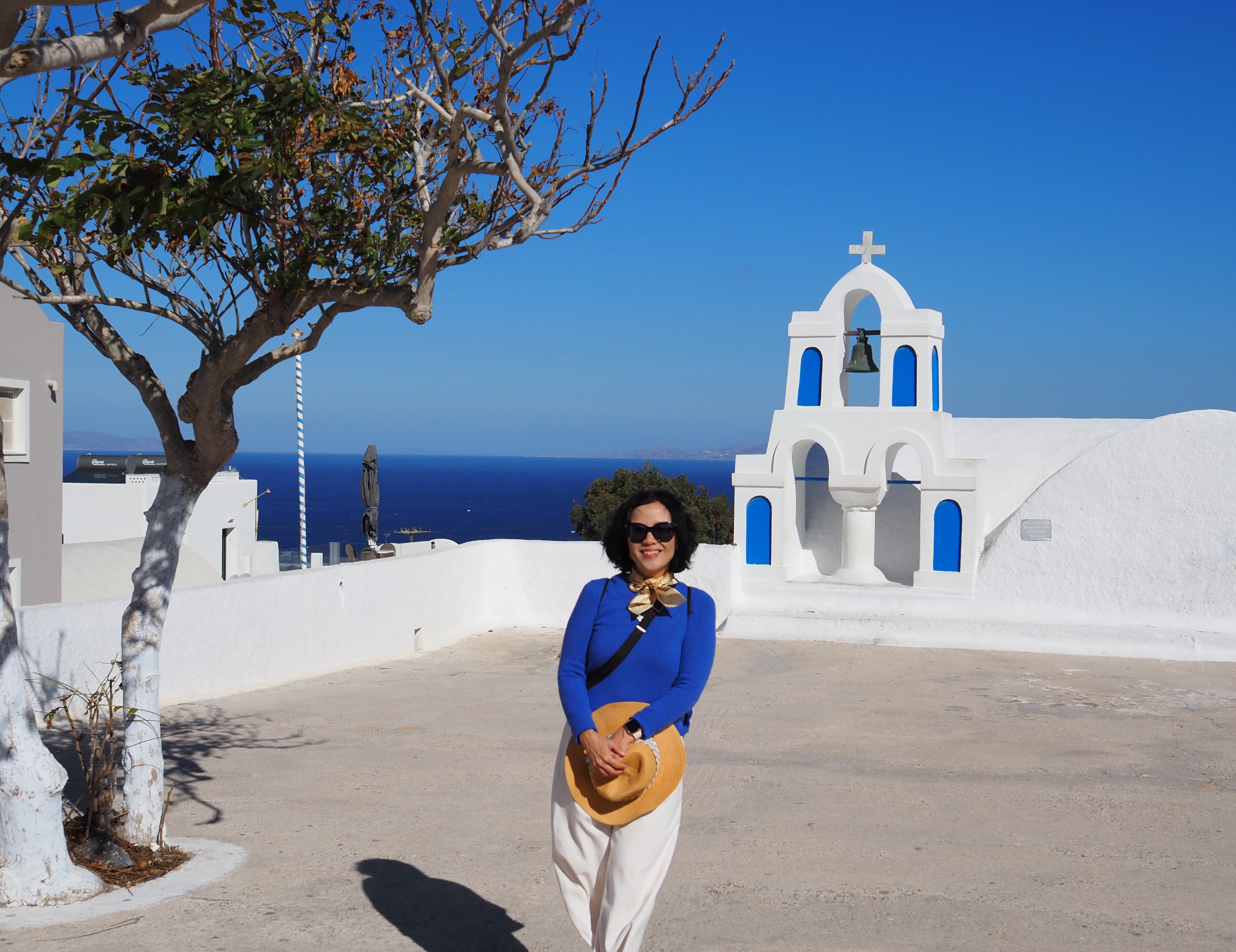 昨天看了攻略,说有个国家地理杂志拍摄的蓝顶教堂就在酒店附近两分钟的路,可以拍出很好看的蓝顶大海和白色教堂钟楼。于是先溜达去那里看看。顺着一家叫 Mama Thira Tavern 餐厅右转上坡,沿路就可以看见标识跟着走到一个停车场,就看到了绝美画面。昨天散步,来回走过几趟都不知道有个好看的蓝顶教堂藏在这个立面教堂后面,被地理位置眼界局限了。