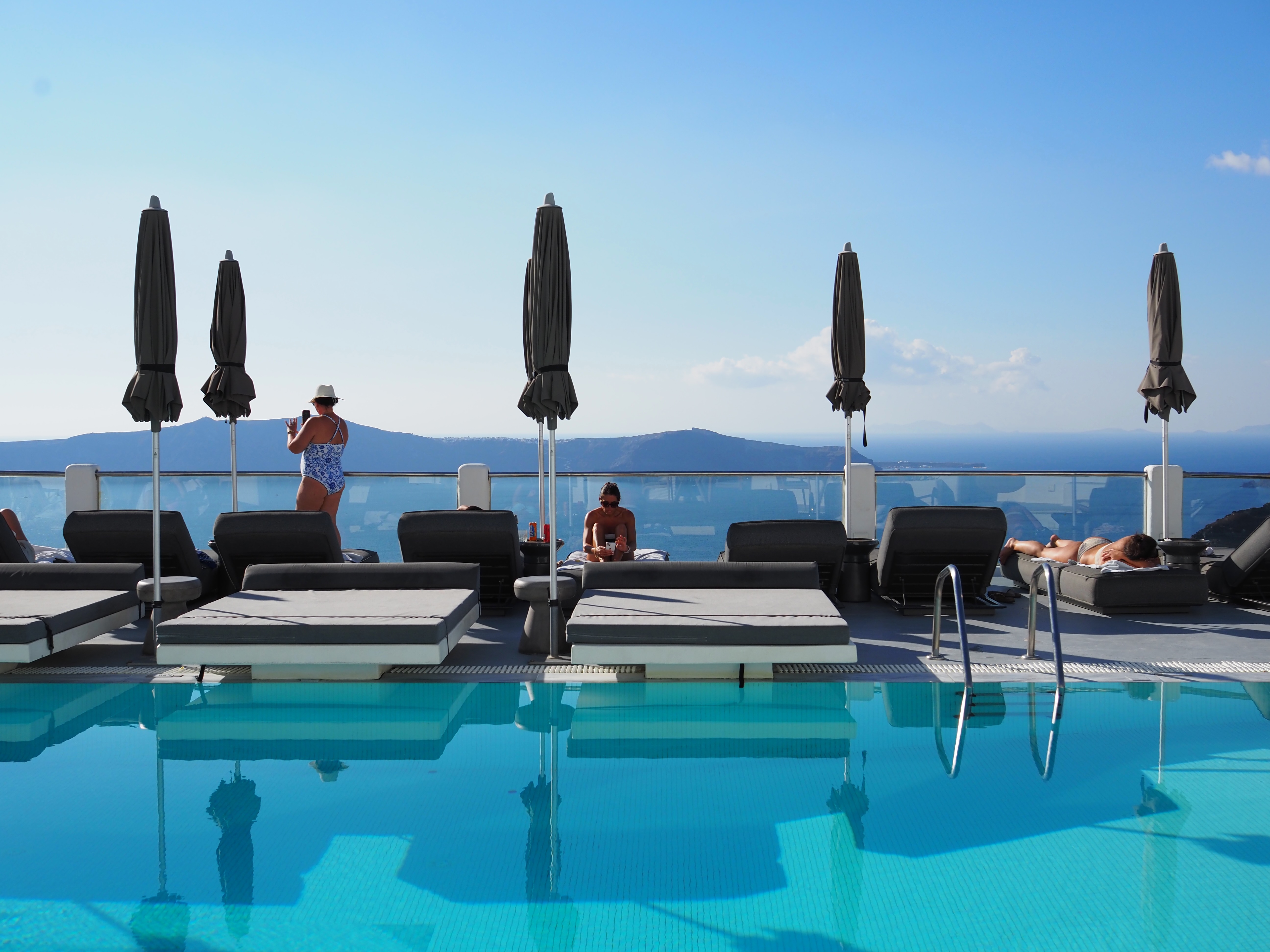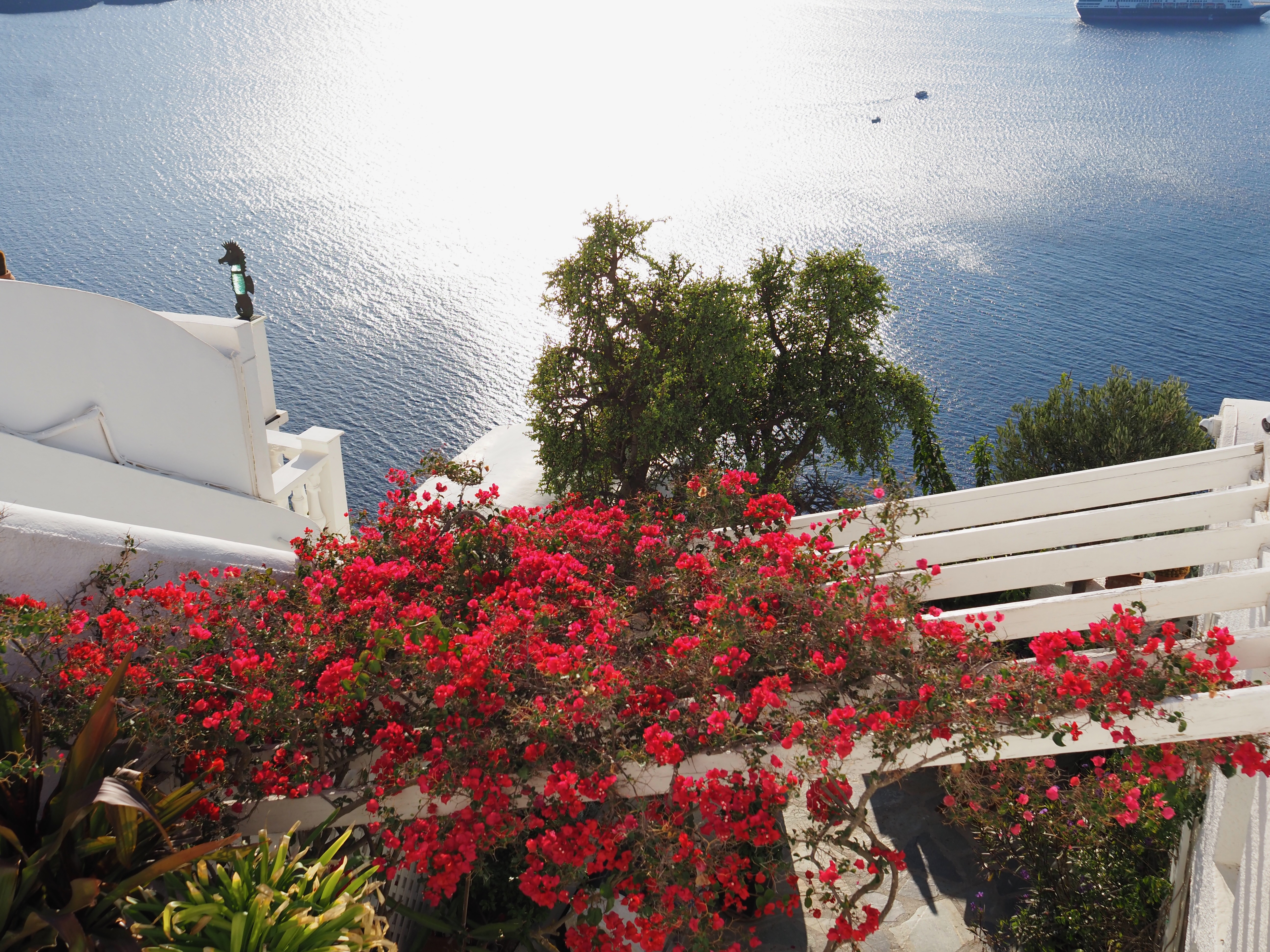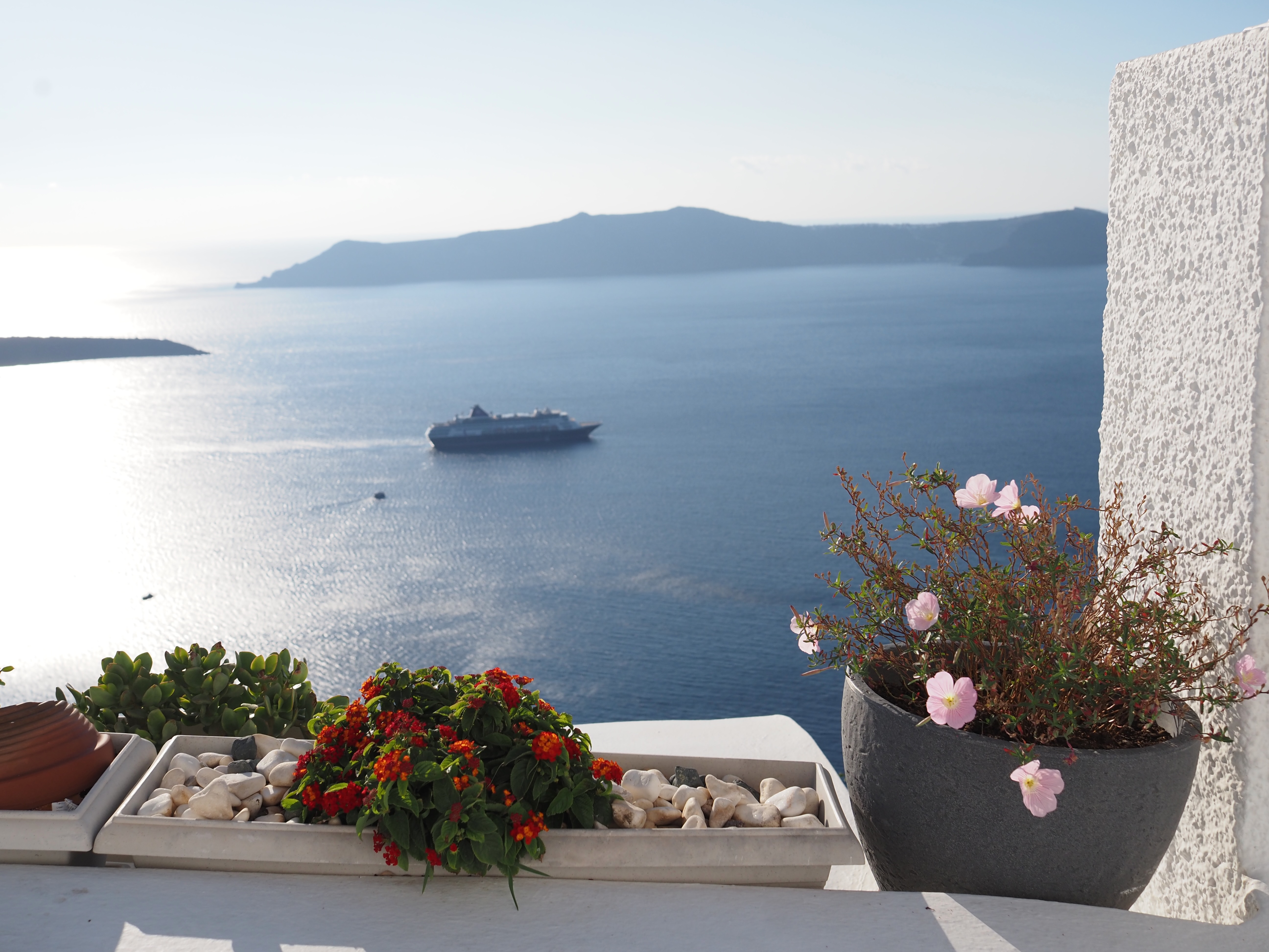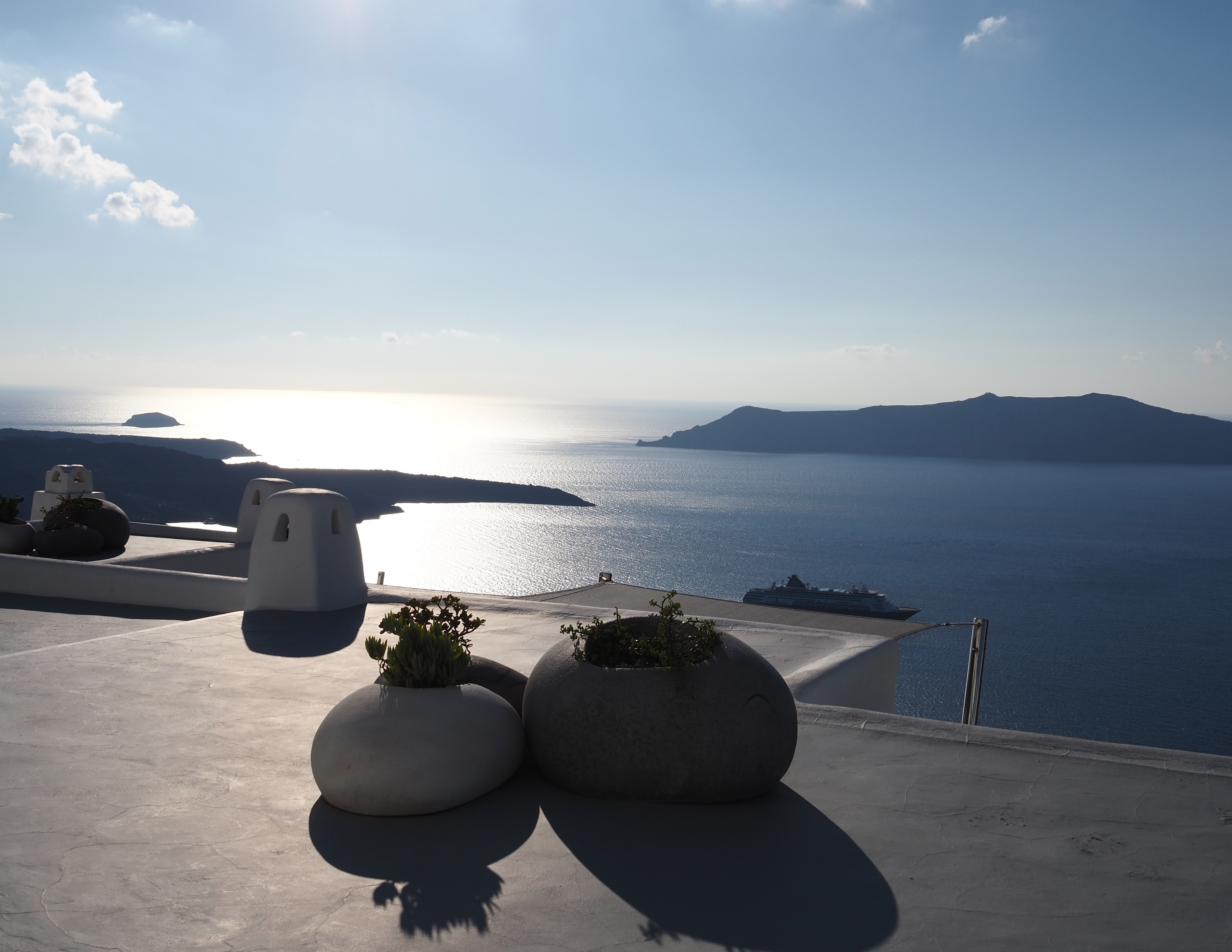 提行李的小伙子很快出现,独自拎着我们两人的行李,带着我们轻松走到房间。订的是海景套房。推开阳台门,眼前便是无边无际的爱琴海——阳光洒在海面上,邮轮静静停泊,远处是火山岩岛的剪影。粼粼波光。