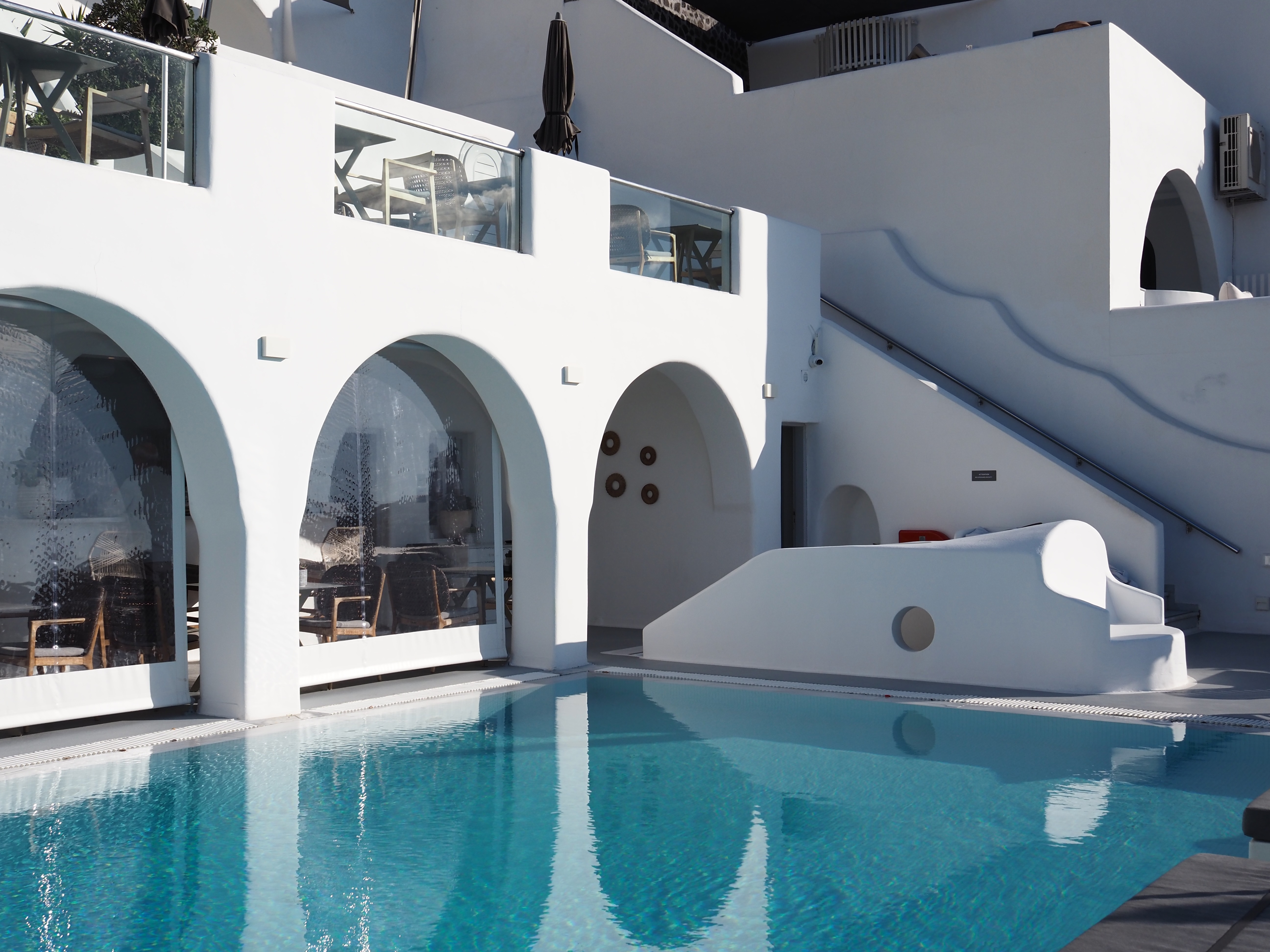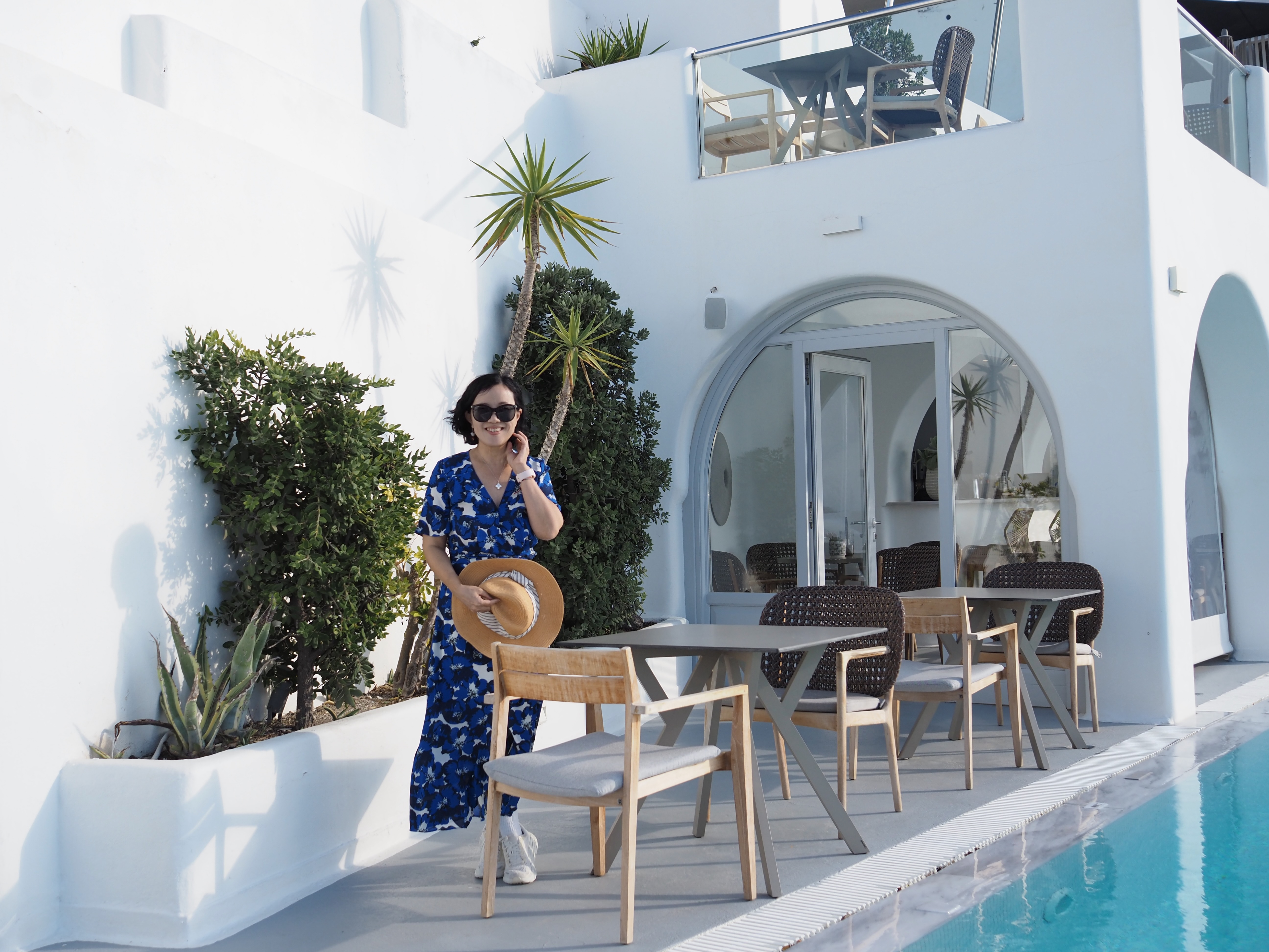 酒店依悬崖而建,洞穴房错落叠加。在转悠的过程中,我才慢慢摸清它的结构。台阶陡峭、层层相连,但处处有惊喜——泳池碧水如镜,院落里花草葱茏,白墙线条流畅而优雅。