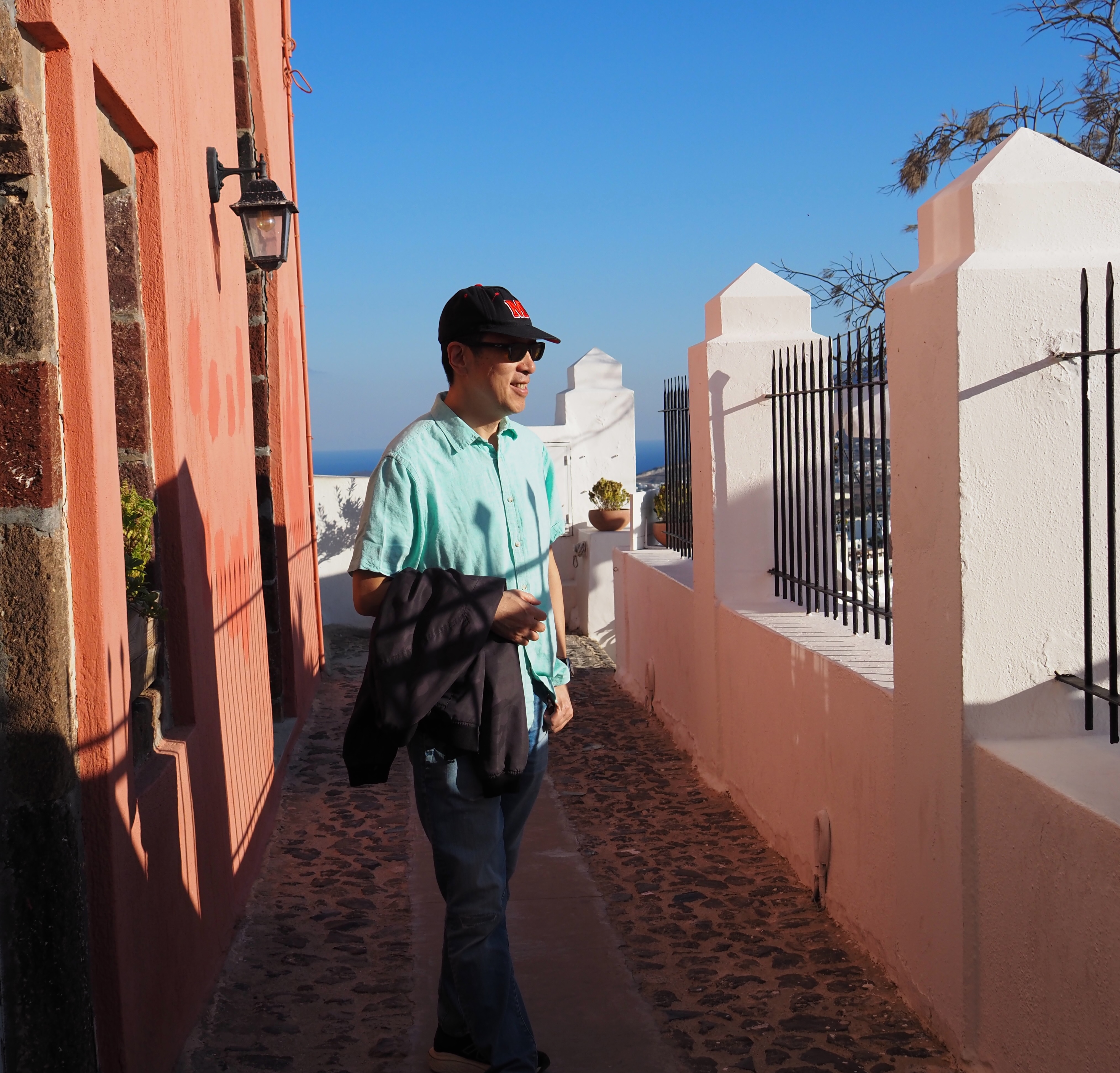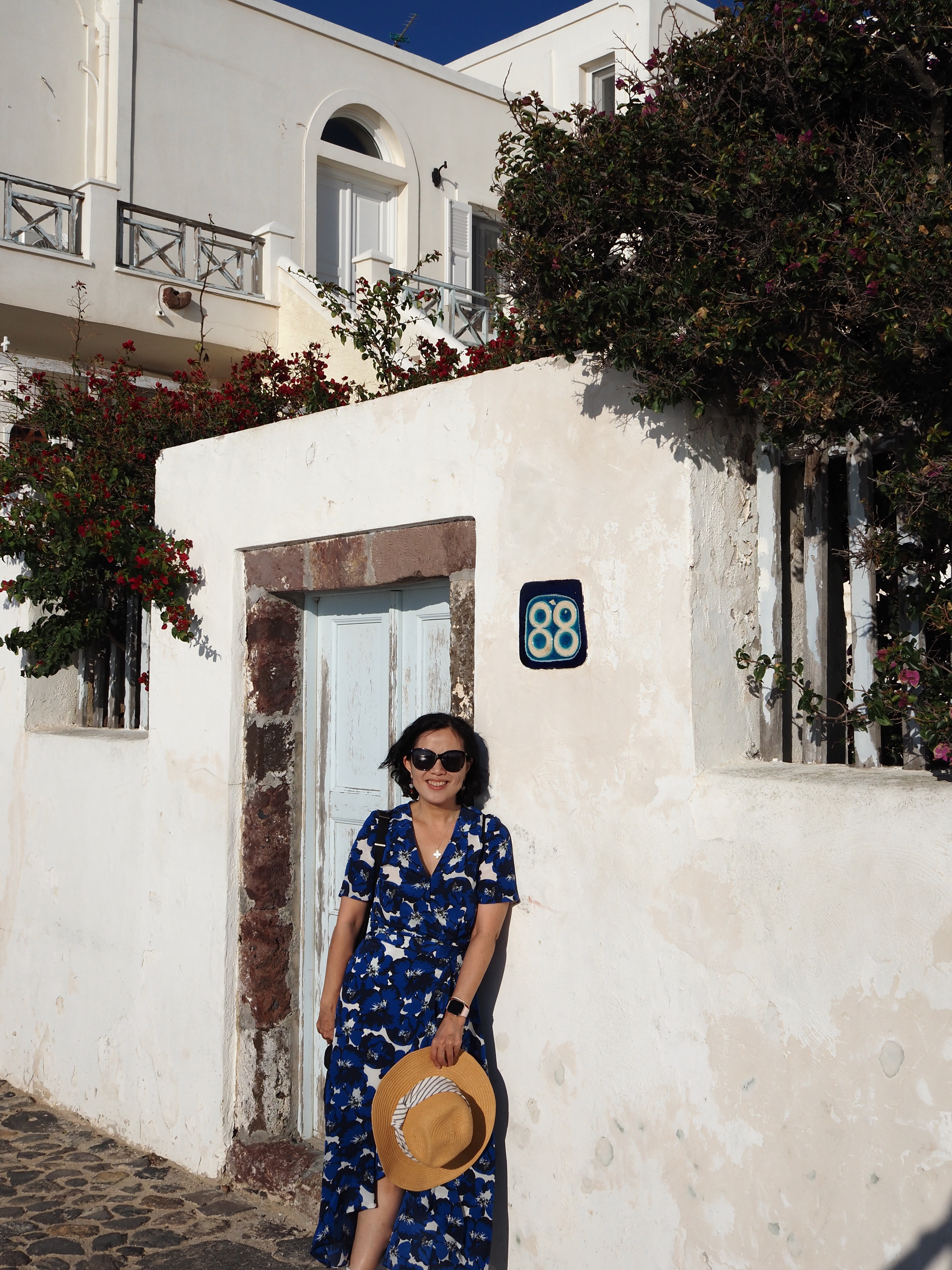 下午,我们沿着小镇步道散步。一路是典型的圣托里尼景象:白墙、蓝门、粉花、远处的海。每走几步,就忍不住停下来拍照。这座岛的美,不在于宏伟,而在于细节的搭配温暖,光影的变幻,颜色的纯粹与简洁。